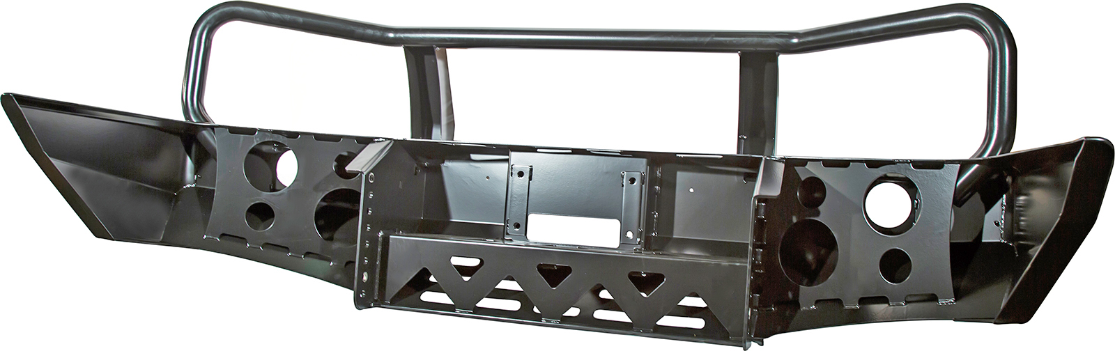 Бампер оснащен мощными упорами под реечный домкрат и буксирными проушинами для работы с рывковой или буксировочной стропой. Тщательно продуманная конструкция внутренних усилителей обеспечивают максимальную надежность бампера, стойкость к высоким нагрузкам и сильным ударам.
