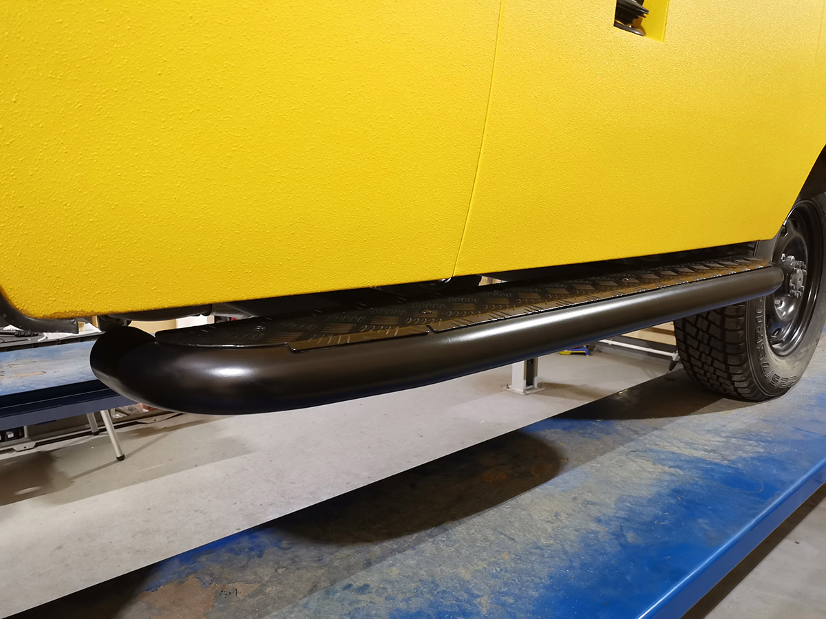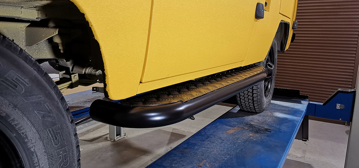 Конструкция порогов РИФ крайне прочна и долговечна, пороги рассчитаны на эксплуатацию в тяжелых условиях – они изготовлены из цельной стальной трубы без применения сварки. Пороги крепятся к раме с помощью стремянок.